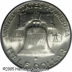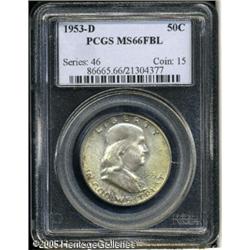 <B>1953-D 50C MS66 Full Bell Lines PCGS.</B></I> As noted by Rick Tomaska, many 1953-D halves are sharply struck but few possess the exotic color necessary for the lofty MS66 FBL grade. This is an exceptionally clean and highly lustrous example that has light golden-yellow coloration on each side with a few darker diagonal stripes in the center of the reverse of unknown origin. Lot:8296