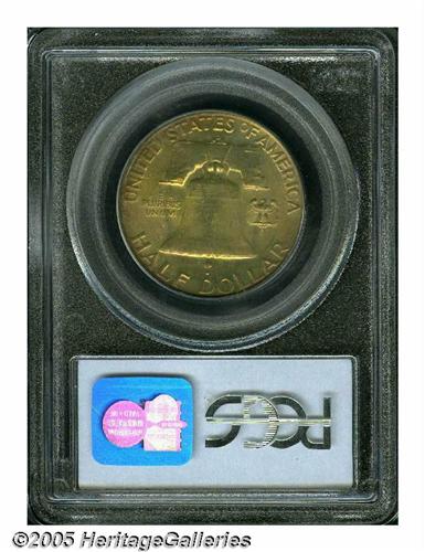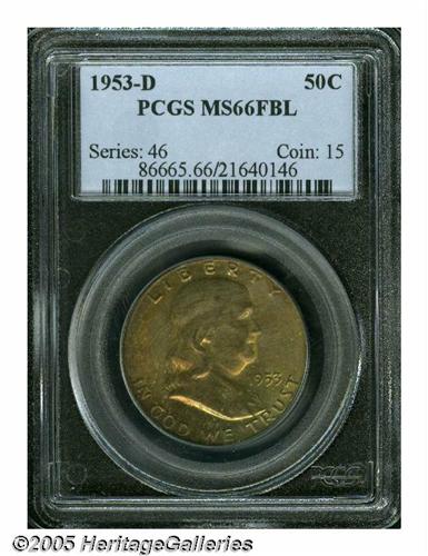 <B>1953-D<50C> MS66 Full Bell Lines PCGS.</B></I> Fully struck with beautiful, rich chartreuse and crimson-pink coloration, and glowing satiny luster. There are a few faint contact marks in evidence, but they are well hidden by the deep toning. A partial fingerprint fragment is located in the left obverse field.