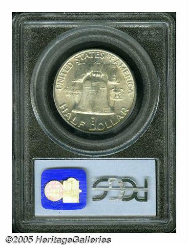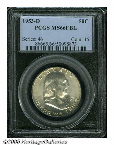<B>1953-D<50C> MS66 Full Bell Lines PCGS.</B></I> Lustrous surfaces display very faint touches of pale blue and yellow-orange color, and exhibit well struck design features. A few trivial marks on Franklin's portrait, and on the Liberty Bell and its beam, are not bothersome. Population: 65 in 66 Full Bell Lines, 0 finer (5/05).