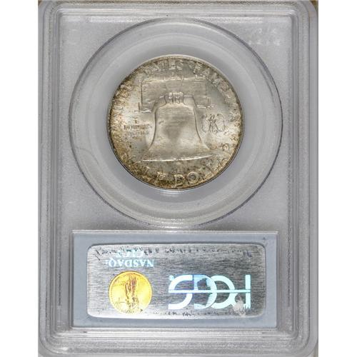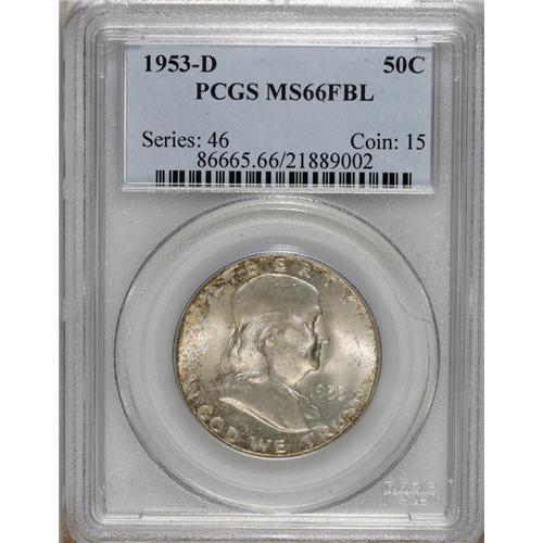 <B>1953-D 50C MS66 Full Bell Lines PCGS.</B></I> Rick Tomaska (2002) writes of the 1953-D half dollar that: " ... few examples exist with the clean surfaces and exotic color needed for a '66.' " He also indicates that: "Heavily bagmarked mint state examples are the rule for this key date." The Premium Gem '53-D specimen for sale in this lot displays pleasing luster and whispers of delicate olive-green, burnt-orange, and forest-green patina. An obviously attentive strike leaves sharp impressions on the design elements, including not only the Full Bell Lines, but on most of the bell lettering as well. A couple of grade-consistent marks are noted on each side. Population: 71 in 66 Full Bell Lines, 1 finer (4/07).<BR><BR><b>Shipping:</b> Coins & Currency (<a target="_blank" href="http://www.heritageauctions.com/common/shipping.php">view shipping information</a>)