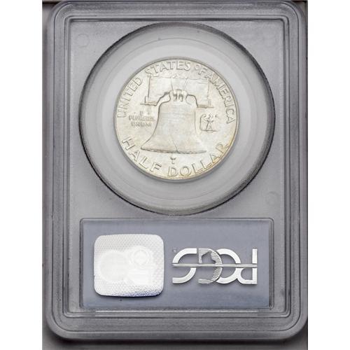 <B>1953-D<50C> MS66 Full Bell Lines PCGS.</B></I> The lustrous surfaces display faint touches of pale blue and yellow-orange on the highpoints, with well struck design features. A few trivial marks on Franklin's portrait and the Liberty Bell are undistracting. Population: 66 in 66, 0 finer (4/06).