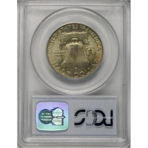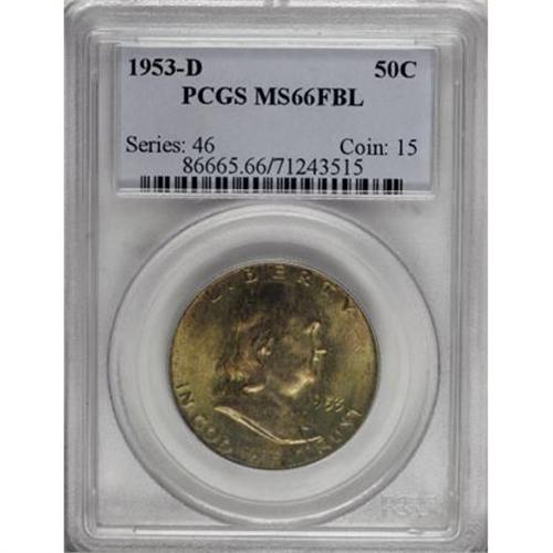 <B>1953-D 50C MS66 Full Bell Lines PCGS.</B></I> Iridescent sea-green and lilac patina bathes this nicely struck and highly lustrous example. The 1953-D was hoarded by the roll, but sharply struck and vividly toned Premium Gems are both scarce and desirable. Population: 73 in 66 Full Bell Lines, 1 finer (9/07).<BR><BR><b>Shipping:</b> Coins & Currency (<a target="_blank" href="http://www.heritageauctions.com/common/shipping.php">view shipping information</a>)
