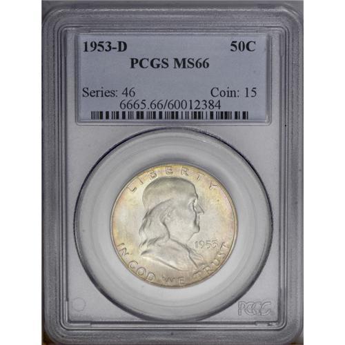 <B>1953-D<50C> MS66 PCGS.</B></I> Iridescent olive-gold, rose, and lime colors endow the borders. This lustrous and refreshingly preserved Premium Gem possesses exceptional eye appeal. The strike is good aside from the all-important bell lines left of the crack. <BR><BR><B>Important notice:</B> Heritage usually auctions material at the rate of 200-250 lots per hour. On some occasions eBay Live bid software or the Internet may not be able to keep up with the pace of the auction. We recommend placing a realistic absentee bid now as insurance to avoid disappointment. Occasionally the auctioneer may eliminate or reject an eBay Live bid, and the auctioneer may also reopen a lot after the close of the eBay live bidding (usually because we missed an audience bid), and may reject your bid even if it shows you as the winning bidder. By bidding via eBay Live, you agree that Heritage may award the lot to another bidder at its sole discretion under the circumstances described above or any other reasonable circumstances. Since eBay bids are not shown to us until we open the lot on the floor, we treat those bids just like floor bids. In most cases the floor responds before the eBay bid is presented to us, due to Internet lag time, so for consistency we have made it a policy that floor bids are always considered first over tie eBay live bids. Also please note that all Heritage lots purchased through eBay Live carry a 20% Buyer's Premium. Please make sure you read the Terms and Conditions before you bid. This lot is being auctioned in conjunction with a live floor auction by Heritage Galleries & Auctioneers. All final auction and invoice information will be supplied by Heritage Galleries & Auctioneers, and all other information should be considered preliminary. Lot:3099 <BR><BR><B>Winning Notification and Billing:</B> After the FINAL session in this auction is complete, Heritage will send e-mail and snail mail invoices. This process normally takes several days. All final auction and invoice information will be supplied by Heritage Galleries & Auctioneers, and all other information should be considered preliminary. <BR><BR>This auction will be conducted on a live auction floor and over the Internet through eBay Live. If you choose to place an absentee bid, please take a moment to <font color='#0000ff'><u><a href='http://pages.ebay.com/liveauctions/help/before/laabsentee.html'>learn how eBay Live absentee bidding works</a></u></font><font color='#000000'>