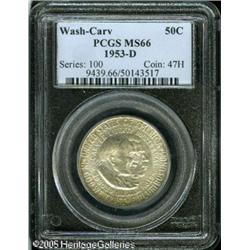 <B>1953-D 50C Washington-Carver MS66 PCGS.</B></I> An essentially untoned coin that shows only the lightest traces of peripheral patina. This highly lustrous Commemorative has an above average strike, and shows just a few small marks. Only 8,003 pieces were produced. Population: 13 in 66, 0 finer (1/05). Lot:8629