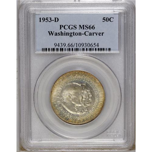 <B>1953-D 50C Washington-Carver MS66 PCGS.</B></I> From an original mintage of just 8,003 pieces comes this lustrous Premium Gem. Soft golden patina covers the obverse periphery, and the devices display acceptable detail. Population: 21 in 66, 0 finer (12/06).<BR><BR><b>Shipping:</b> Coin/Currency (<a target="_blank" href="http://www.heritageauctions.com/common/shipping.php">view shipping information</a>)
