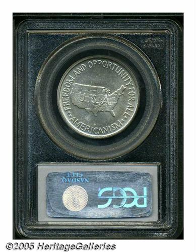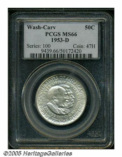 <B>1953-D<50C> Washington-Carver MS66 PCGS.</B></I> Lightly toned in honey hues, this lustrous Gem has an above average strike for the type. Only the state of Texas and the cheekbone of George Washington Carver show noticeable striations from the planchet prior to the strike. Just 8,003 pieces were struck, with the extra three coins undoubtedly reserved for Assay. Population: 13 in 66, 0 finer (4/05).