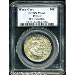 <B>1953-D<50C> Washington-Carver MS66 PCGS.</B></I> This well preserved example is a conditionally rare representative of this 1950s Commemorative production. Dappled apricot and golden-red tinting is draped over richly frosted features. There are a few small ticks in the centers, none of which are out of context with the assigned grade. Combined NGC and PCGS Population: 13 in 66, there are no coins certified finer (6/04).<BR><I>Ex: New York Signature Sale (Heritage, 7/02), lot 5126, which realized $4,485.</B></I><BR><I>From the JFS Collection, the #1 All-Time PCGS Registry Set.</B></I> <BR><BR><B>Important notice:</B> Heritage usually auctions material at the rate of 200-250 lots per hour. On some occasions eBay Live bid software or the Internet may not be able to keep up with the pace of the auction. We recommend placing a realistic absentee bid now as insurance to avoid disappointment. Occasionally the auctioneer may eliminate or reject an eBay Live bid, and the auctioneer may also reopen a lot after the close of the eBay live bidding (usually because we missed an audience bid), and may reject your bid even if it shows you as the winning bidder. By bidding via eBay Live, you agree that Heritage may award the lot to another bidder at its sole discretion under the circumstances described above or any other reasonable circumstances. Since eBay bids are not shown to us until we open the lot on the floor, we treat those bids just like floor bids. In most cases the floor responds before the eBay bid is presented to us, due to Internet lag time, so for consistency we have made it a policy that floor bids are always considered first over tie eBay live bids. Also please note that all Heritage lots purchased through eBay Live carry a 20% Buyer's Premium. Please make sure you read the Terms and Conditions before you bid. </span></font></tr></table></td></tr></table>
