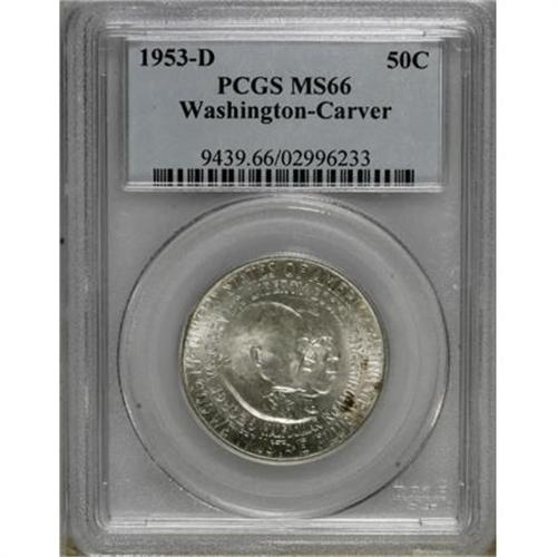 <B>1953-D 50C Washington-Carver MS66 PCGS.</B></I> This bold Premium Gem displays silver-white brilliance throughout, with a couple of almond-colored toning spots on the obverse. A few light marks preclude a finer grade, but MS66 is the highest certified grade assigned to this issue at both NGC and PCGS (3/08).<BR><BR><b>Shipping:</b> Coins & Currency (<a target="_blank" href="http://www.heritageauctions.com/common/shipping.php">view shipping information</a>)