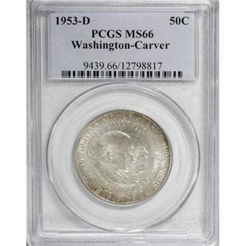 <B>1953-D 50C Washington-Carver MS66 PCGS.</B></I> Tan-brown and cream alternate across this satiny and nicely struck Premium Gem. This issue has a mintage of only 8,003 pieces, and surprisingly few have been certified in better Mint State grades. Population: 27 in 66, 0 finer (2/08).<BR><BR><b>Shipping:</b> Coins & Currency (<a target="_blank" href="http://www.heritageauctions.com/common/shipping.php">view shipping information</a>)