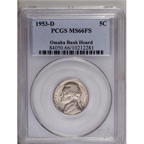 <B>1953-D<5C> MS66 Full Steps PCGS.</B></I> Ex: Omaha Bank Hoard. Green-gray toning is consistent aside from a dash of powder-blue on the upper portrait. This unabraded Premium Gem has satin luster, and is struck from worn dies. Population: 12 in 66 Full Steps, 0 finer (7/06).