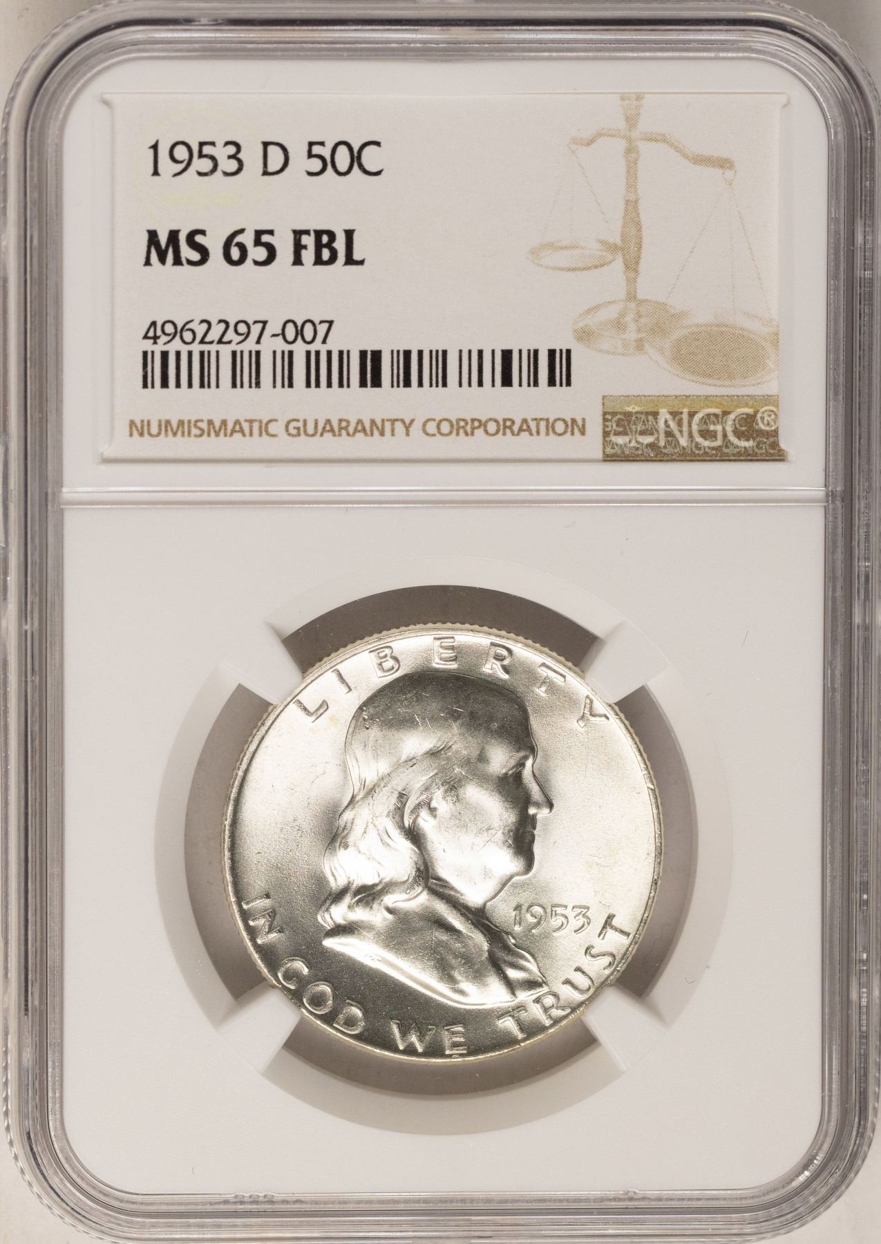 One 1953-D Franklin Half Dollar Coin NGC MS65FBL.