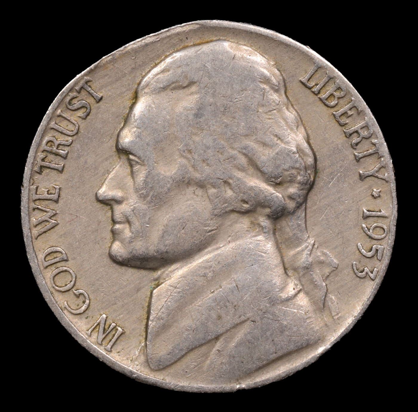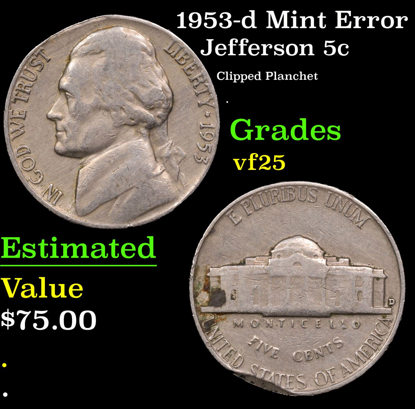 1953-D Jefferson Nickel Mint Error 5c Grades vf+