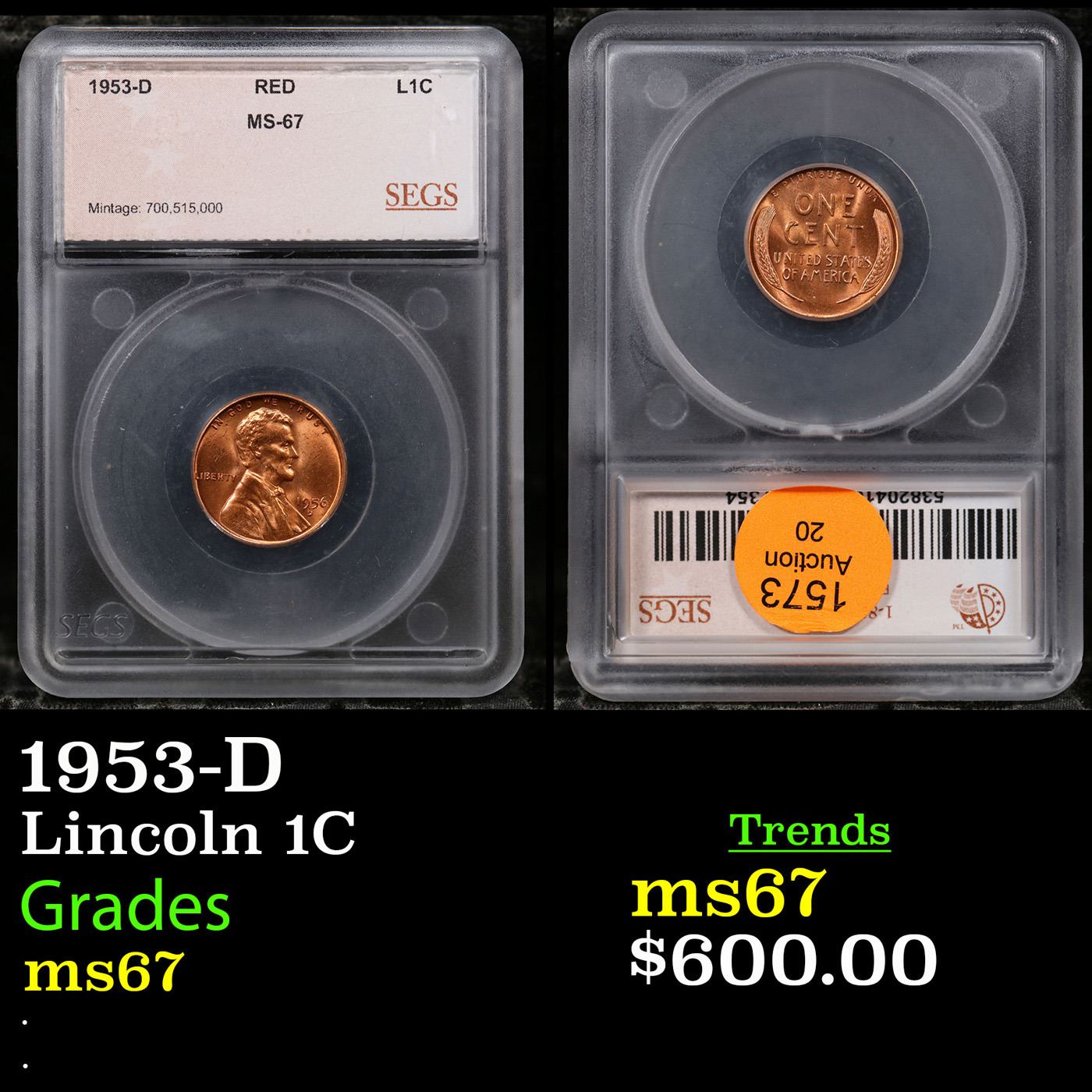 1953-D Lincoln Cent 1c Graded ms67 By SEGS.