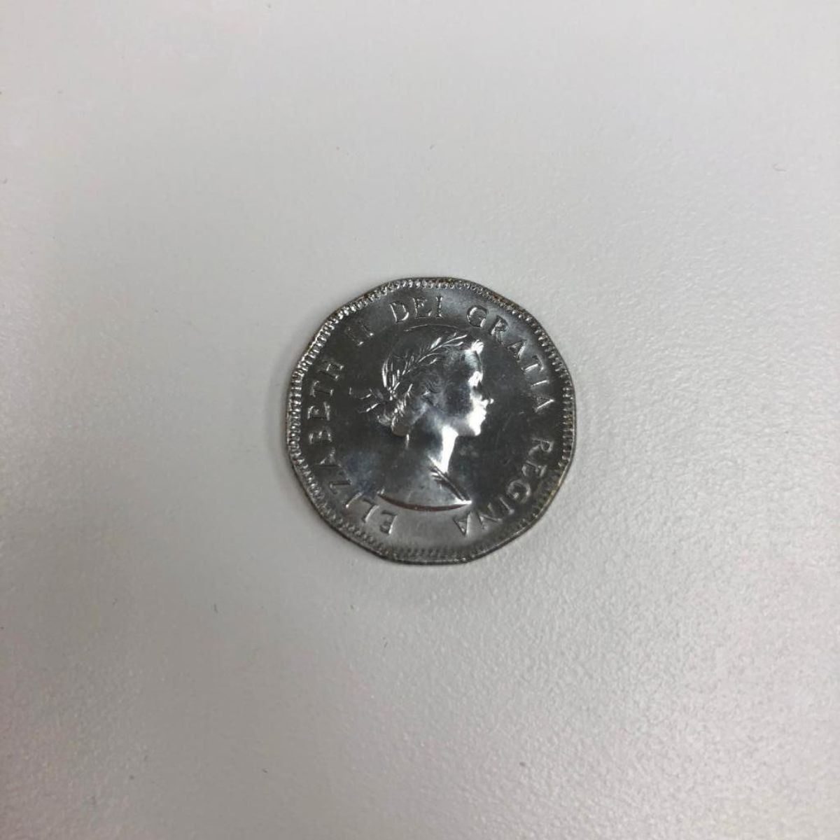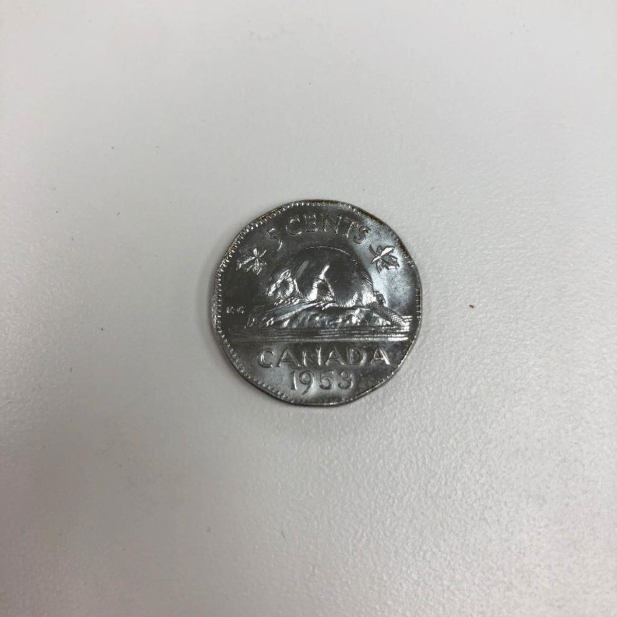 Obverse The portrait in right profile of Elizabeth II, when she was 27 years old, is surrounded with the inscription "ELIZABETH II DEI GRATIA REGINA" (Elizabeth II, Queen by the grace of God) Lettering: ELIZABETH II DEI GRATIA REGINA M·G· Engraver: Mary Gillick Reverse A beaver, over the inscription "CANADA", is surrounded with the face value, flanked on both sides by a maple leaf. Lettering: 5 CENTS K·G CANADA 1953 Specifications Country: Canada Type: Standard circulation coin Years: 1953-1954 Value: 5 Cents (0.05 CAD) Composition: Chromium plated steel Weight: 4.54 g Diameter: 21.234 mm Thickness: 1.70 mm Shape: Dodecagonal (12-sided)