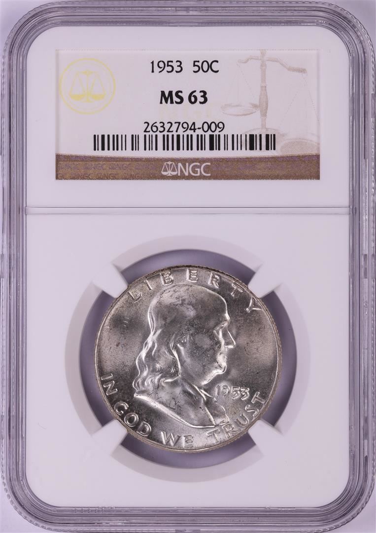 One 1953 Franklin Half Dollar Coin NGC MS63. NGC Certified.