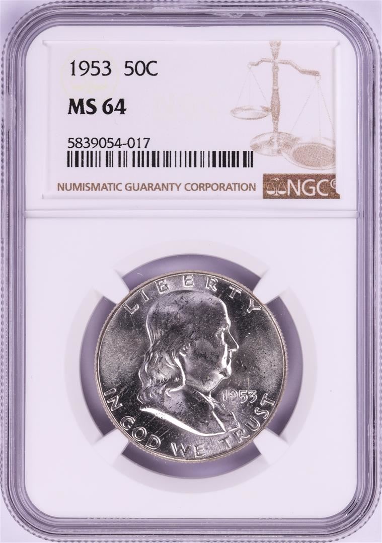 One 1953 Franklin Half Dollar Coin NGC MS64. NGC Certified.
