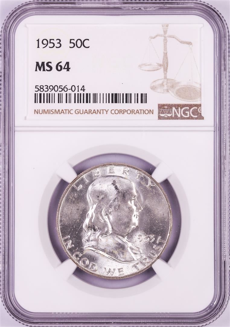 One 1953 Franklin Half Dollar Coin NGC MS64. NGC Certified.