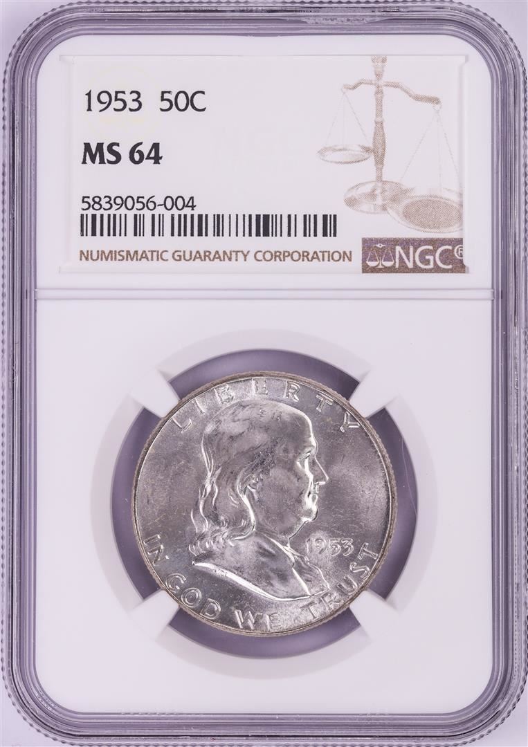 One 1953 Franklin Half Dollar Coin NGC MS64. NGC Certified.