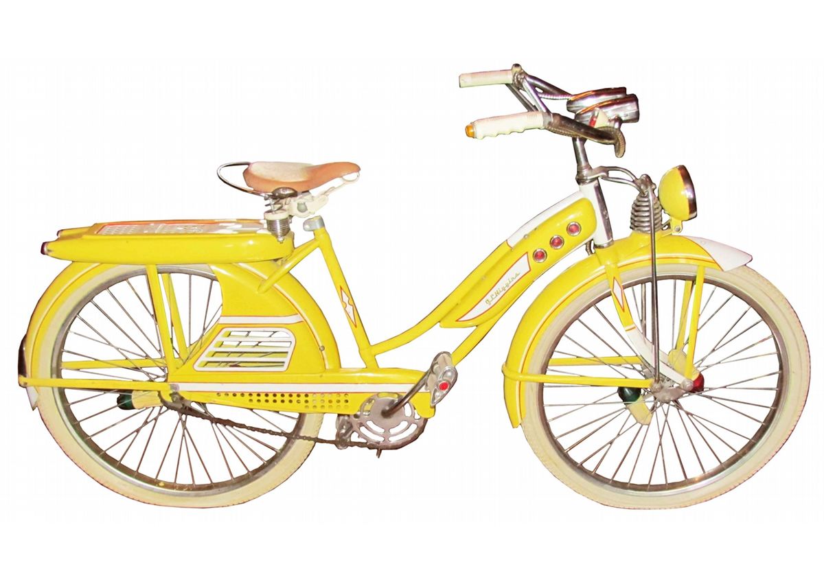 1953 J.C. Higgins Yellow Bicycle. This 1953 JC Higgins Color Flow was the top of the line sold by Sears’s department store. All original besides the lightning Dart whitewalls from Carlisle Tire and Rubber. There are many special features like a Batwing light, side skirts, Bumble Bee springer and the quality chrome from the 1950 on this Color Flow.