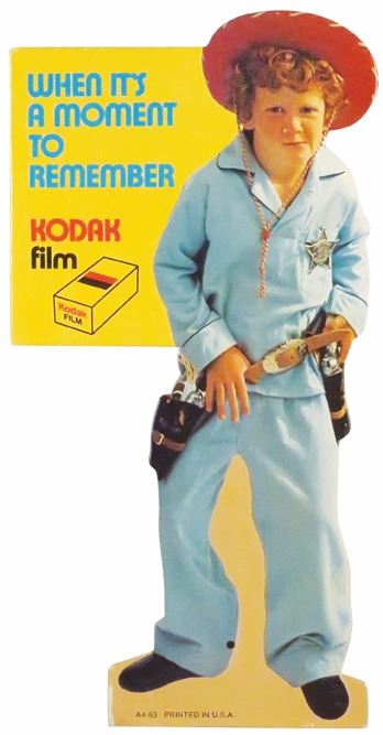 1953 Kodak Die Cut Cardboard Countertop Display Easel Back Sign. Great image bringing out the Western movies of the time. Minor edgewear otherwise very good condition. 5 X 10 inches.