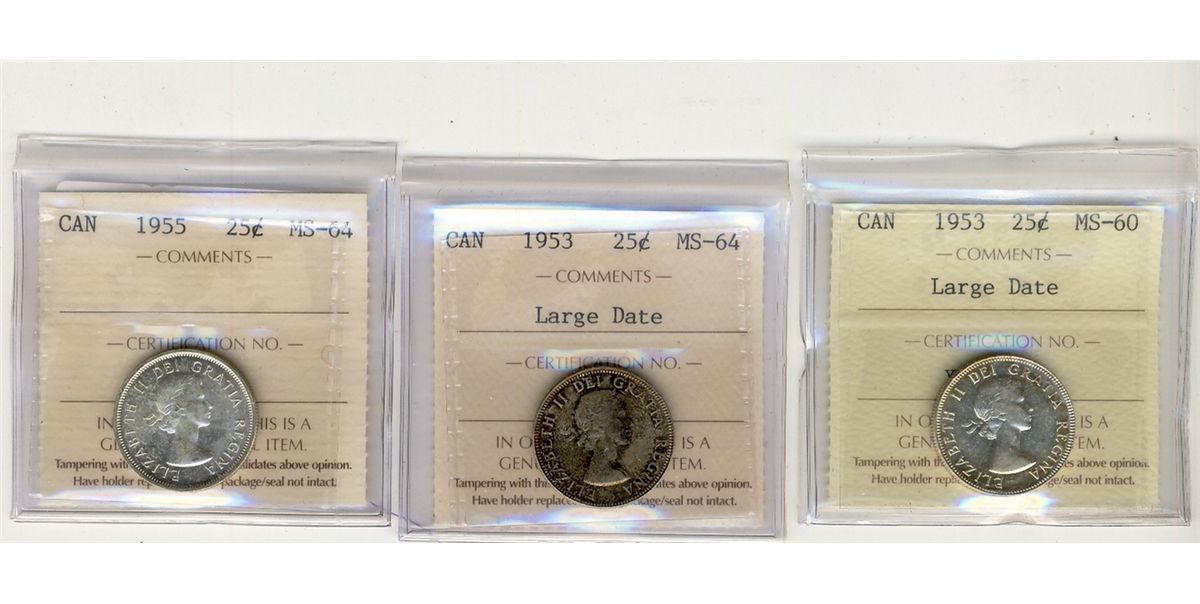 1953 LD MS60, 1953 LD and 1955 25 Cents, ICCS MS64; Three coins.