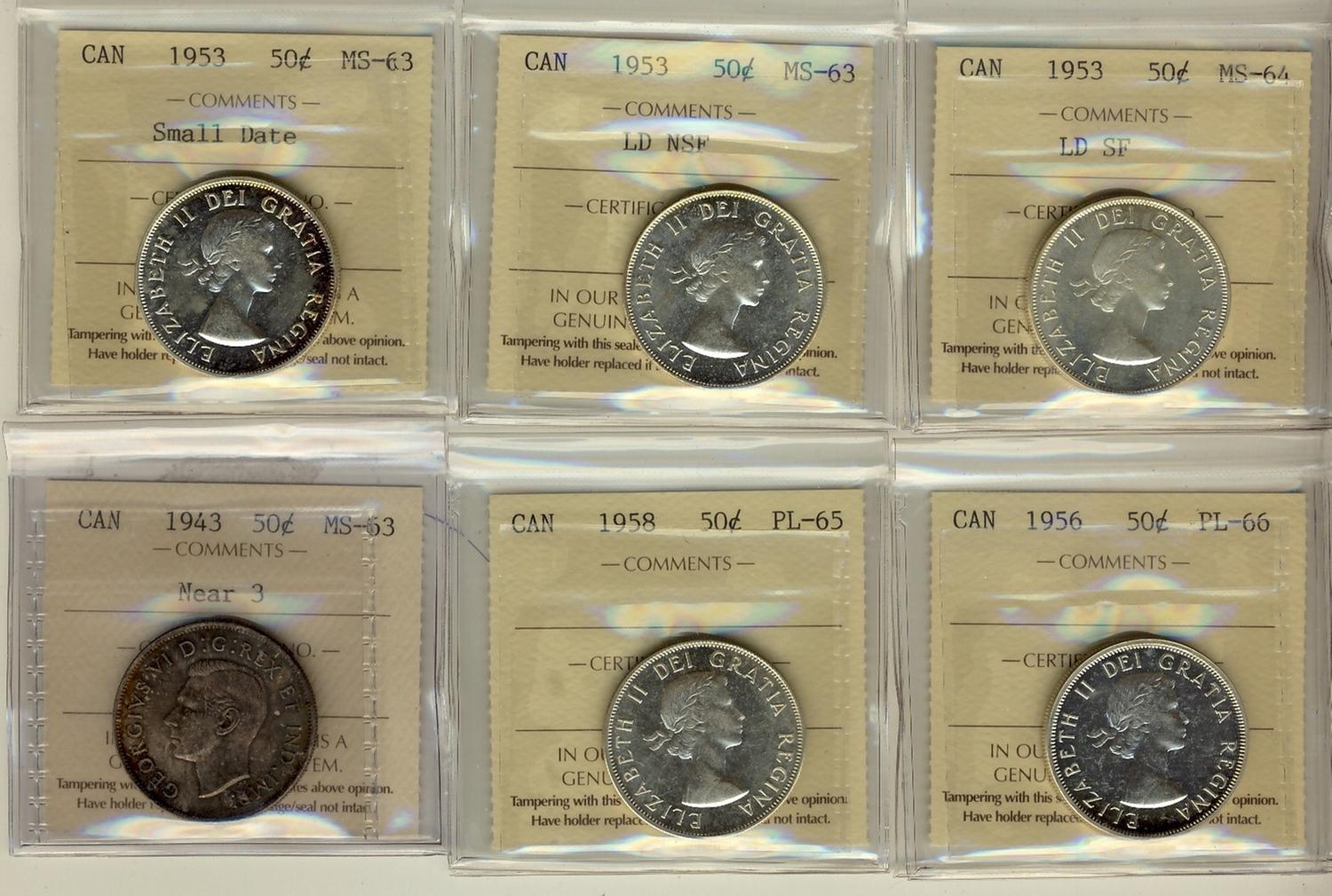 1953 LDSF MS64, LD NSF MS63, Sml Date MS63, 1956 PL66, 1958 PL65 & 1943 Nr 3 MS63 50¢. Lot of 6 ICC