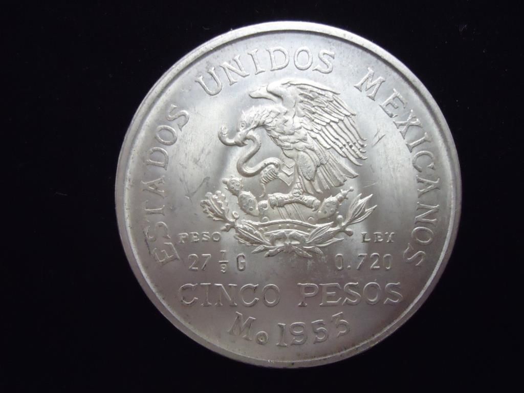 1953 MEXICO SILVER 5 PESOS UNC .6430 OZ. ASW