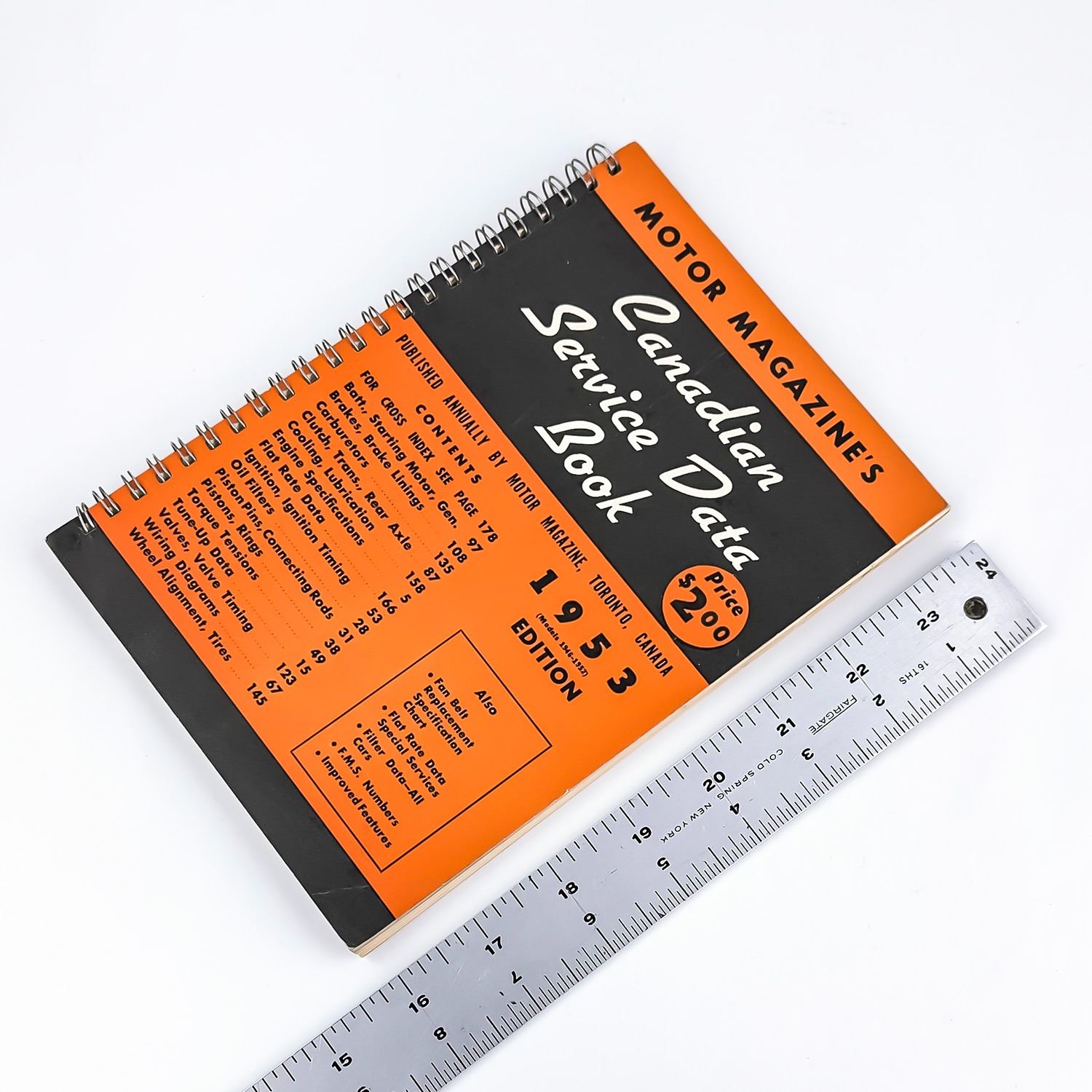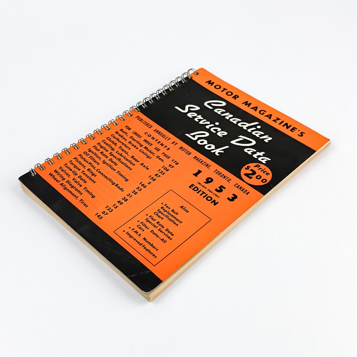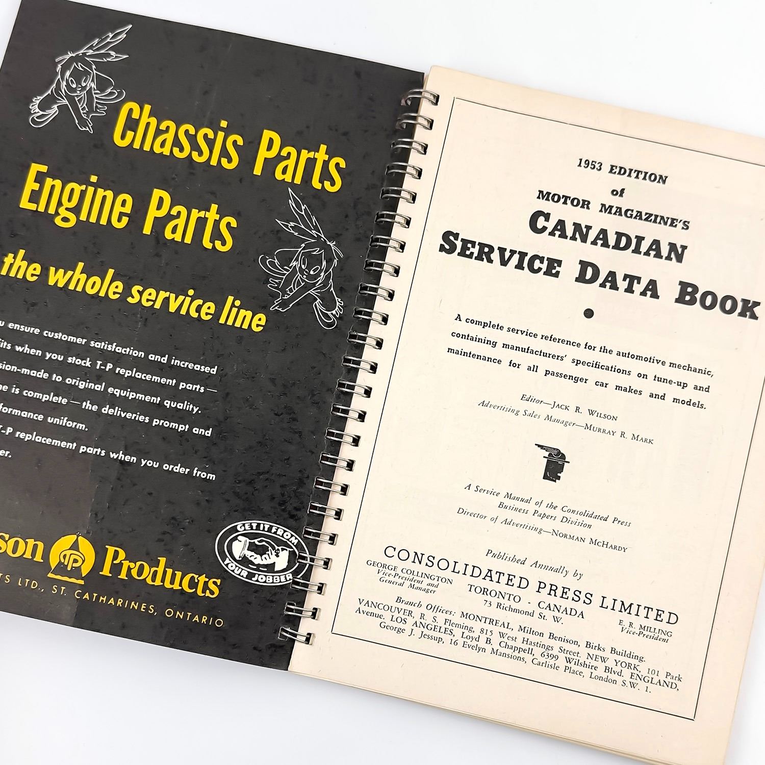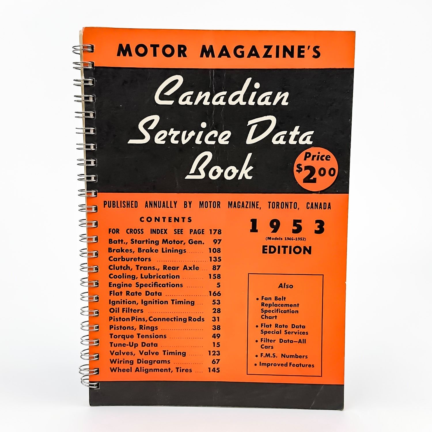 #9058 - VINTAGE ORIGINAL 1953 (MODELS 1946-1952) MOTOR MAGAZINE’S CANADIAN SERVICE DATA BOOK. A COMPLETE SERVICE REFERENCE FOR THE AUTOMOTIVE MECHANIC. SEE PHOTOS FOR MORE INFO. PUBLISHED ANNUALLY BY MOTOR MAGAZINE, TORONTO, CANADA. SPIRAL BINDING - 179 PAGES.