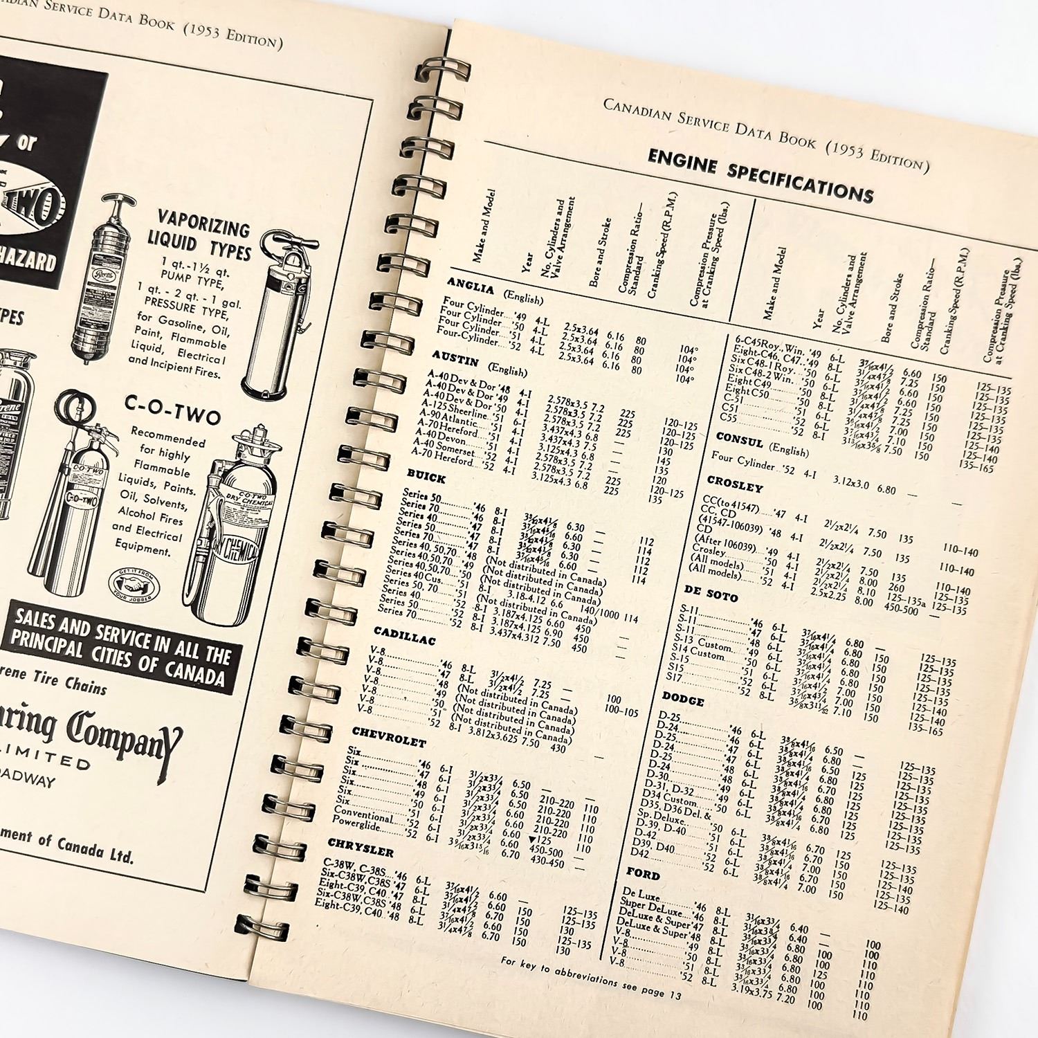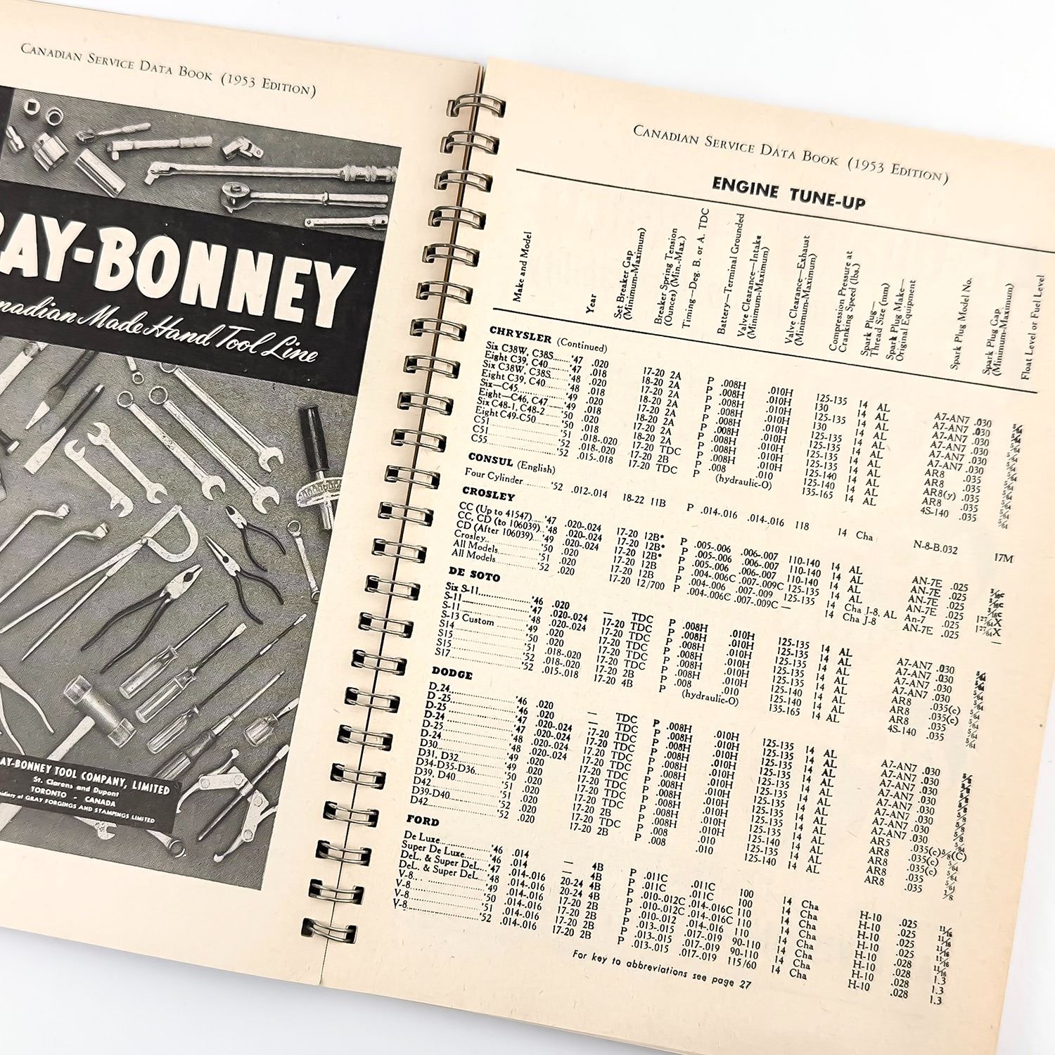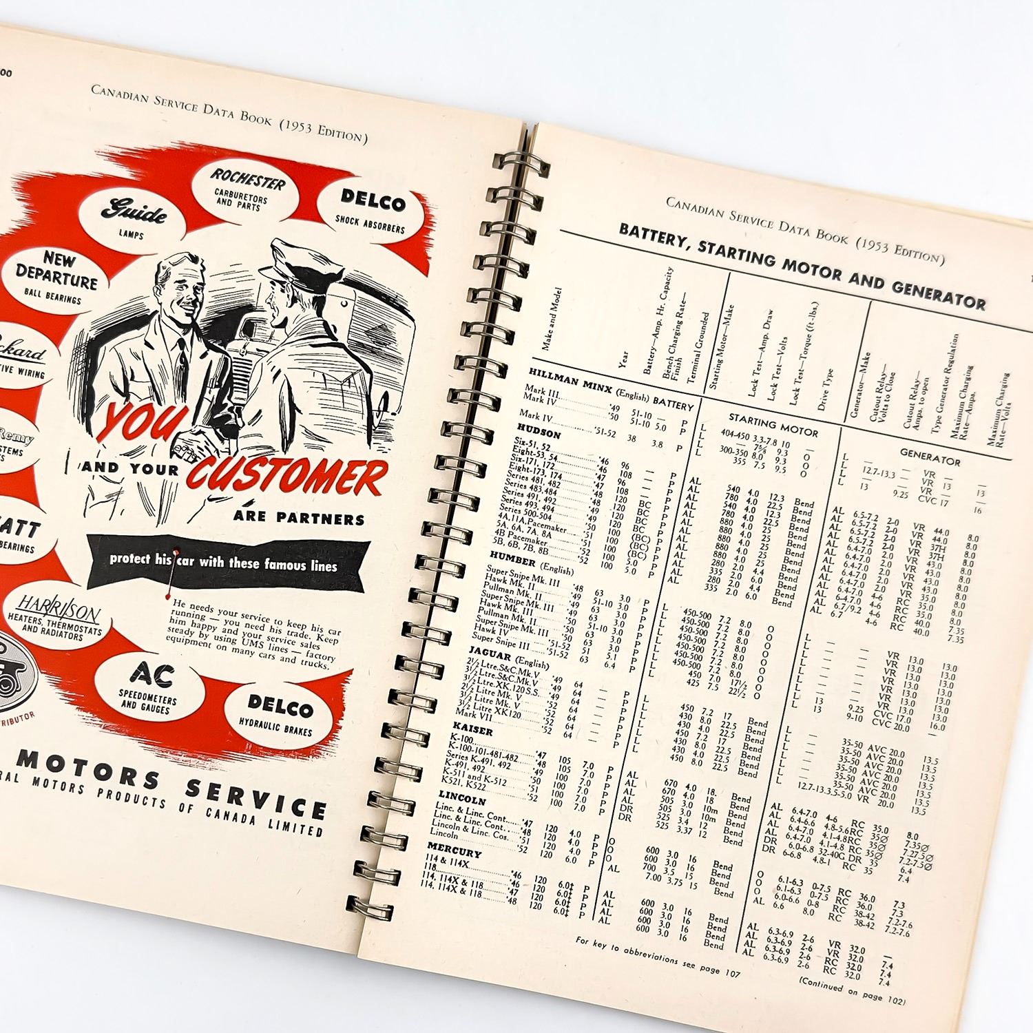 #9058 - VINTAGE ORIGINAL 1953 (MODELS 1946-1952) MOTOR MAGAZINE’S CANADIAN SERVICE DATA BOOK. A COMPLETE SERVICE REFERENCE FOR THE AUTOMOTIVE MECHANIC. SEE PHOTOS FOR MORE INFO. PUBLISHED ANNUALLY BY MOTOR MAGAZINE, TORONTO, CANADA. SPIRAL BINDING - 179 PAGES.