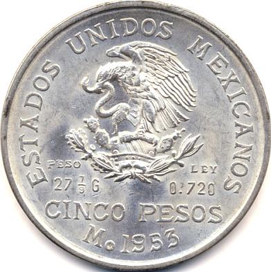 1953 Mo MEXICO SILVER CINCO PESOS-CH BU+