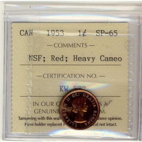 1953 NSF 1¢ ICCS SP-65 HEAVY CAMEO PQ+ Full Red. Wow! An amazing "Elizabeth II" Small cent. Excellent strike with clean fields and great mirror surfaces.