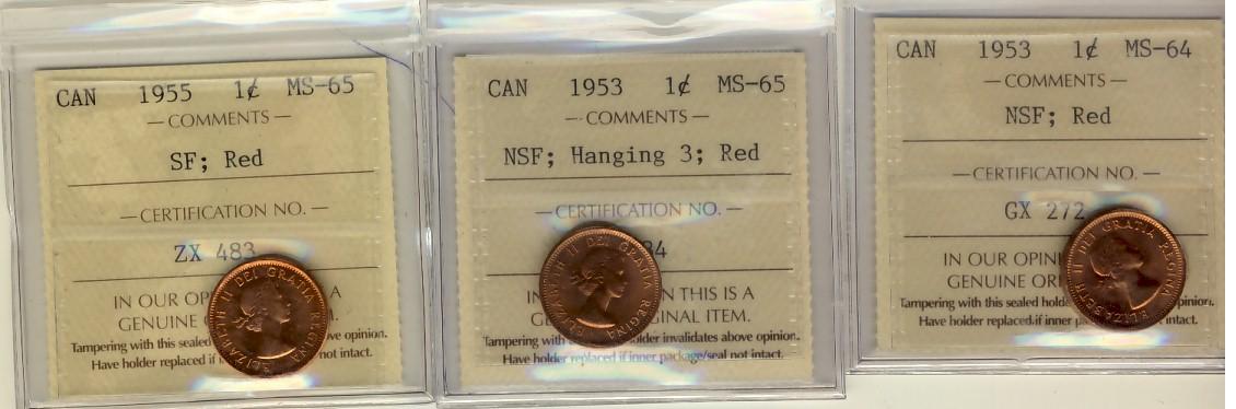 1953 NSF, 1953 NSF Hanging 3 & 1955 SF 1¢ ICCS MS65RD. Lot of 3 coins. 1953 NSF is MS64.