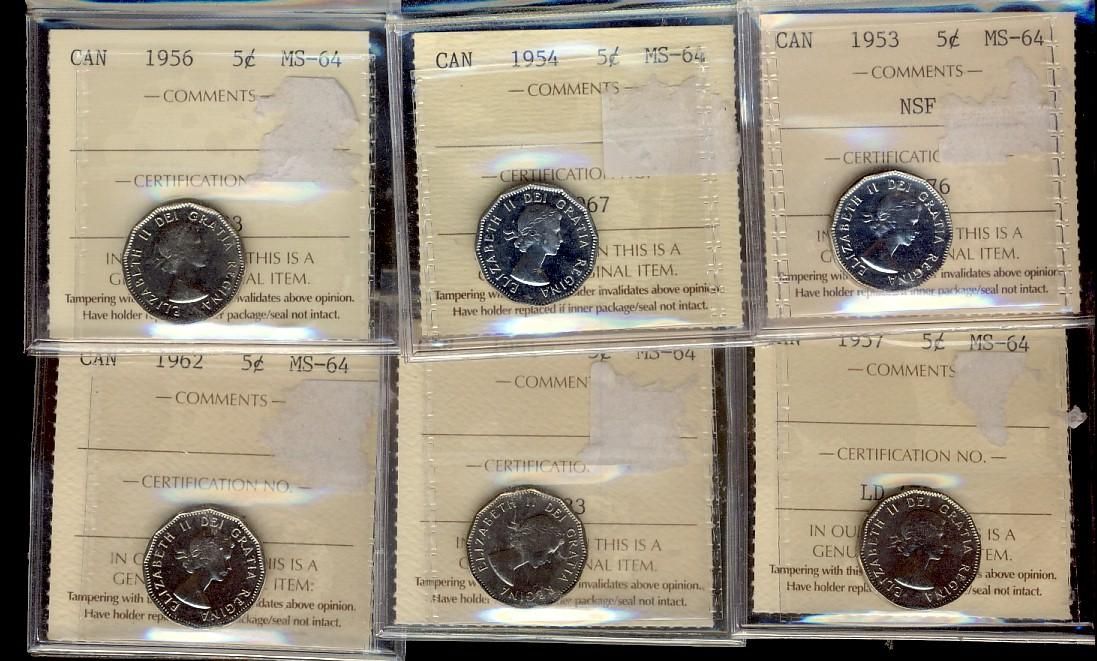 1953 NSF, 1954, 1956, 1957, 1961 & 1962 5¢ ICCS MS64. Lot of 6 coins.