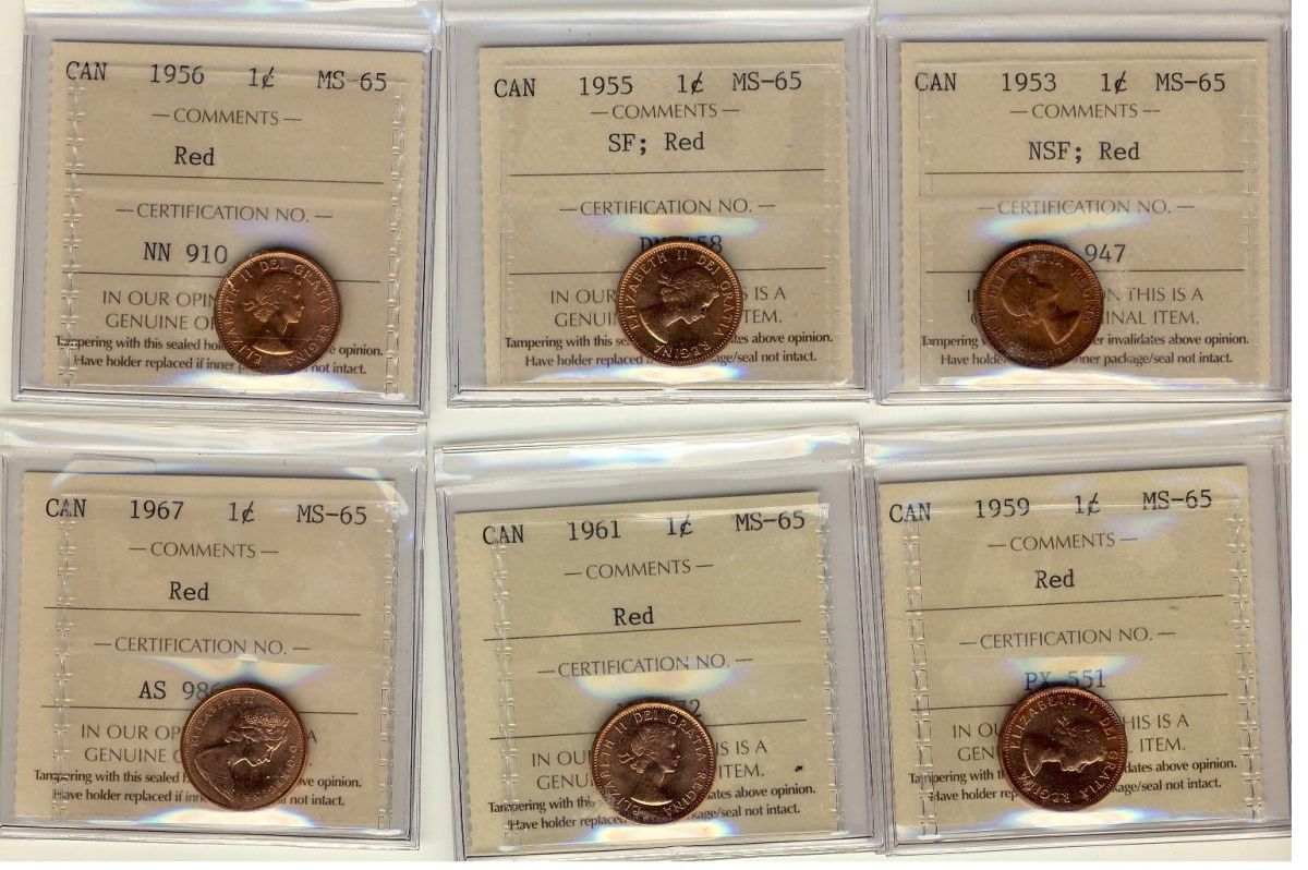 1953 NSF, 1955, 1956, 1959, 1961 & 1967 1¢ ICCS MS65RD. Lot of 6 full red coins.