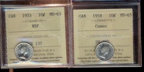 1953 NSF & 1958 10¢ ICCS MS65, Lot of two coins both brilliant and lustrous.