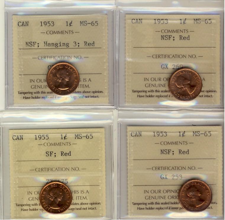 1953 NSF(2), 1953 NSF Hanging 3 & 1955 SF 1¢ ICCS MS65RD. 1953 NSF is MS64. Lot of 4 coins.