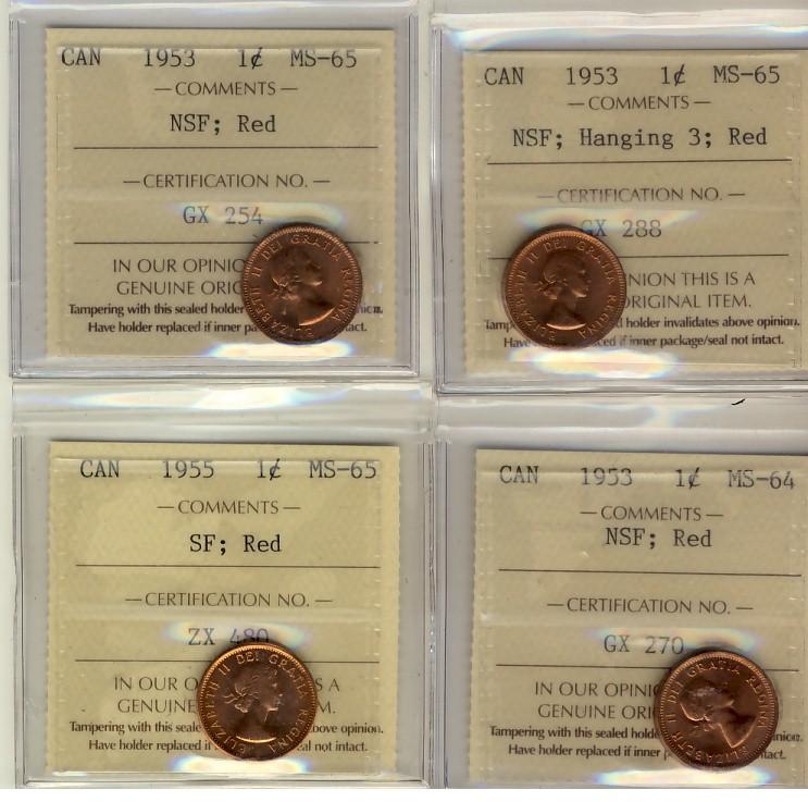 1953 NSF(2), 1953 NSF Hanging 3 & 1955 SF 1¢ ICCS MS65RD. Lot of 4 coins.