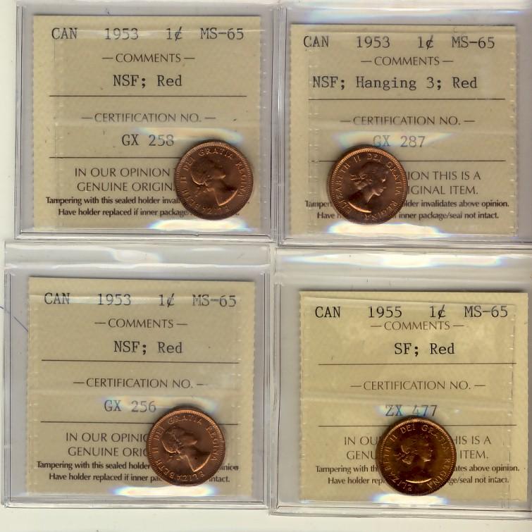 1953 NSF(2), 1953 NSF Hanging 3 & 1955 SF 1¢ ICCS MS65RD. Lot of 4 coins.