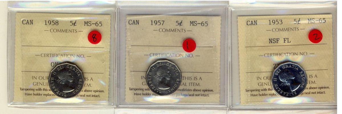 1953 NSF FL, 1957 & 1958 5¢ MS65. Lot of 3 ICCS coins.
