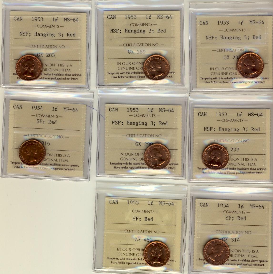 1953 NSF Hanging 3(5), 1954 SF(2) & 1955 SF(1) 1¢ ICCS MS64RD. Lot of 8 coins.