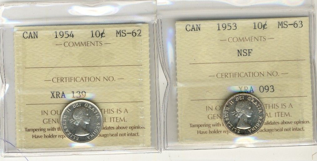 1953 NSF MS63, 1954 10 Cents MS62; Two ICCS coins.