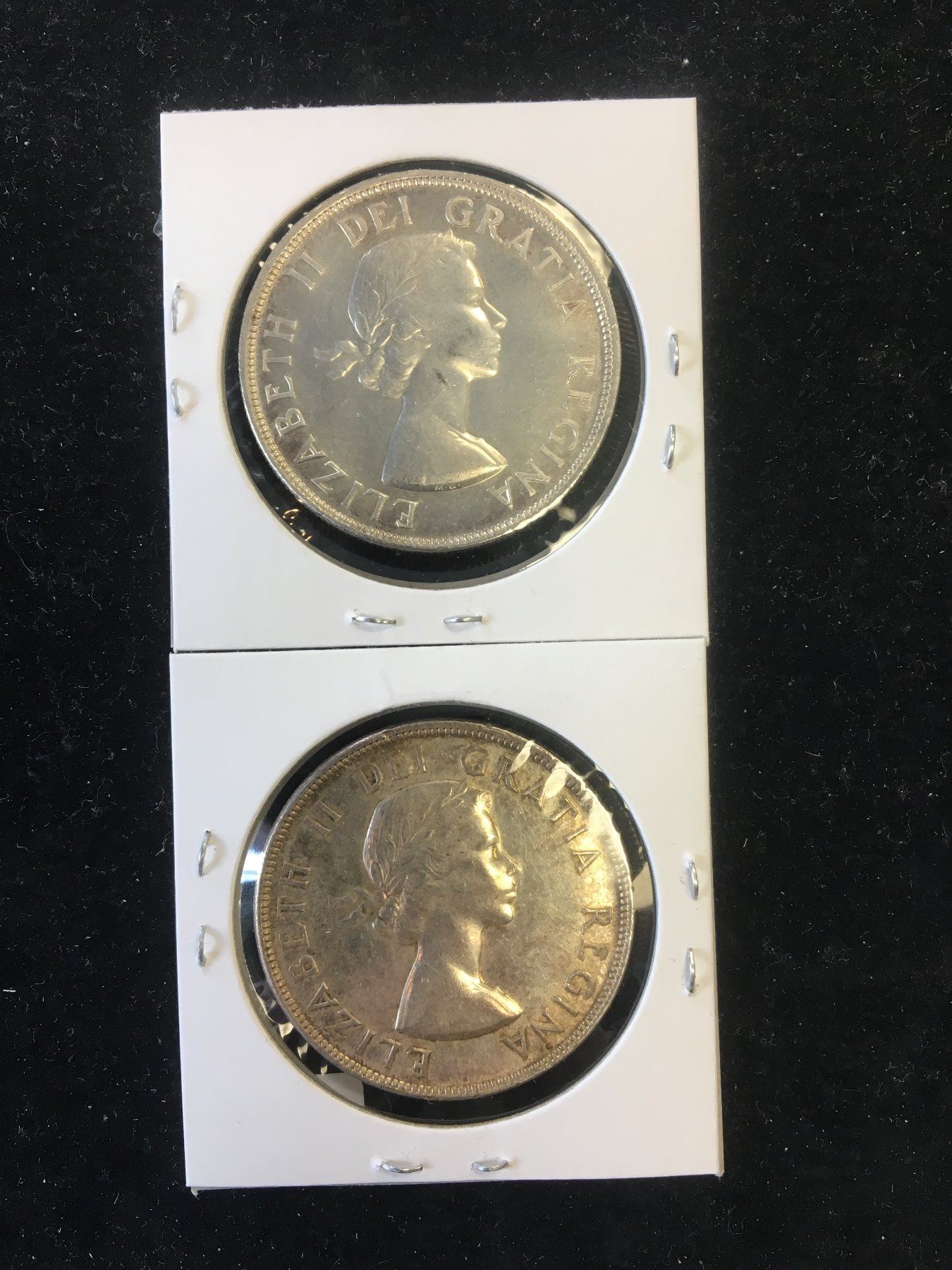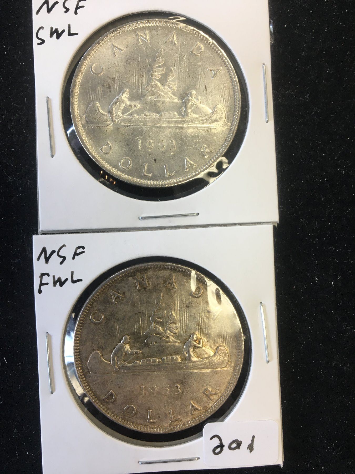 NICE LOT OF 2 CANADA SILVER DOLLARS.NSF,FWL AND NSF,SWL..NICE VARIETIES!! AU GRADES