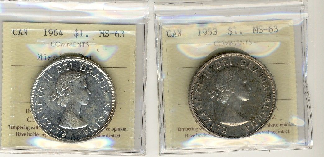 1953 NSF and 1964 Missing, 1 Dollars, ICCS MS63; Two coins.