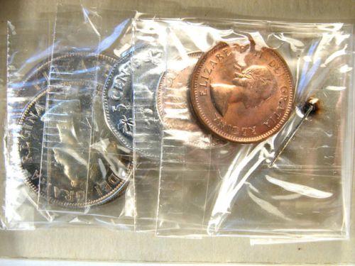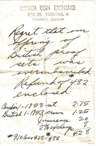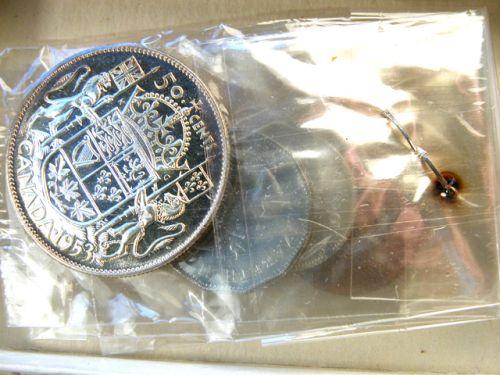 Canada 1953 No Shoulder Fold Year Set missing the Dollar. Stapled in cellophane envelopes and in the small white Bank of Canada box with invoice. A nice original set, Choice Uncirculated and better, the 10 Cents looks Gem. The Cent is Red and the silver has attractive light toning