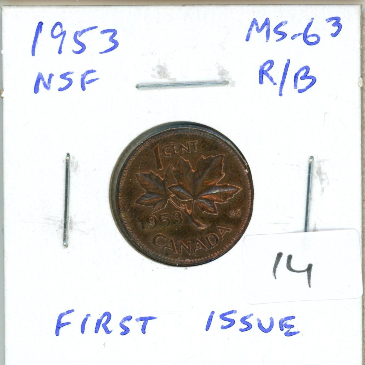 1953 No Shoulder Fold Small Cent. First issue of Queen Elizabeth. MS-63 Red & Brown.