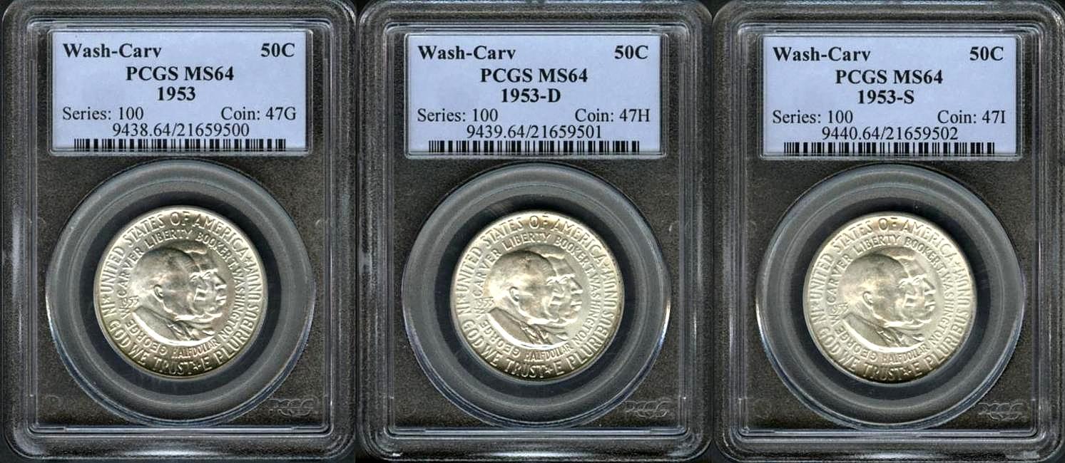 1953 P-D-S WASHINGTON-CARVER SILVER COMMEMORATIVES-ALL PCGS MS64