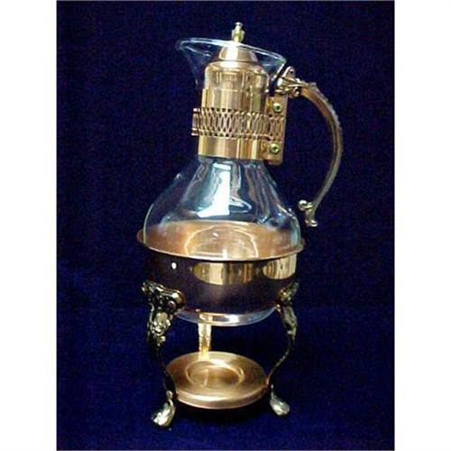 </font></strong>A Princess House glass carafe with a copper handle, collar and stopper. It rests on a 3-legged copper base that cradles the carafe above a holder for a candle or small sterno can. The overall height of the carafe and stand is approximately 13 ½ inches, with the carafe itself being 10 ¼ inches tall and about 5 ½ inches in diameter at its widest part. The collar has a filigree pattern and the rather ornate handle is attached to it with screws so that both may be removed for washing and cleaning, or replacement of the carafe. The stopper also is copper with a turned brass finial atop. The copper base is 6 ½ inches tall. The ?cradle? for the carafe is 6 inches in diameter at the top. It is affixed to 3 ornate copper legs with rivets and approximately 3 inches below the cradle is a second smaller base to serve as a holder for a candle or other source of heat. The pieces are clean and bright, there is no apparent damage nor are there any stamps or makers marks. </font>
