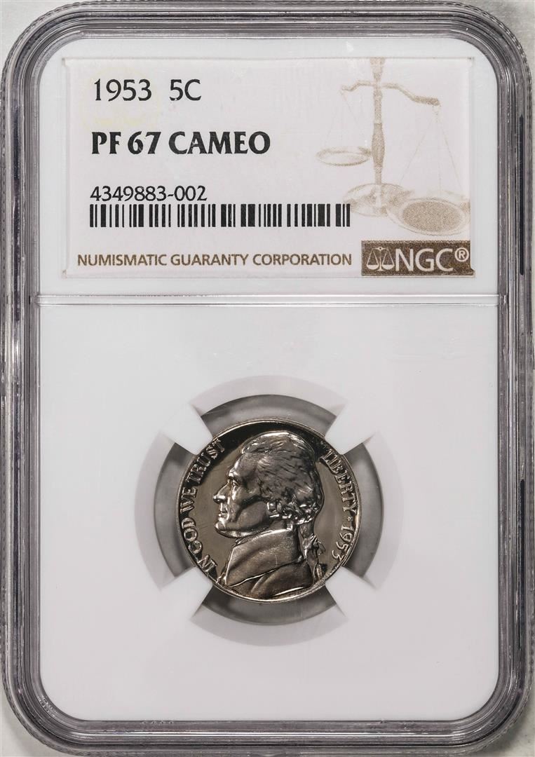 One 1953 Proof Jefferson Nickel Coin NGC PF67 Cameo. NGC Certified.