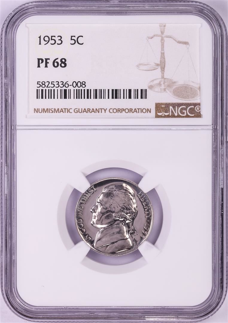 One 1953 Proof Jefferson Nickel Coin NGC PF68. NGC Certified.