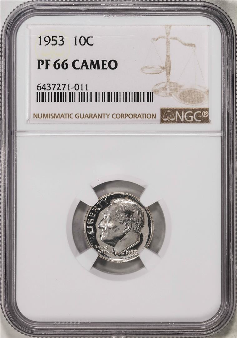 One 1953 Proof Roosevelt Dime Coin NGC PF66 Cameo. NGC Certified.